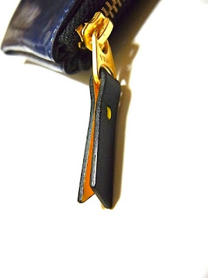 ネイビーのエナメルレザーに六角鋲の装飾。